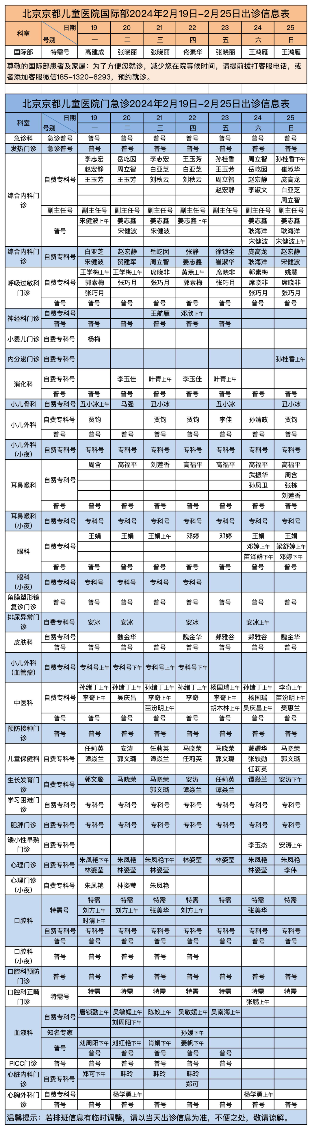 2024年2月19日-2月25日门诊出诊信息表