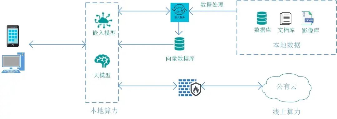医院信息IT团队通过自有技术能力,联合硬件厂商资源,使用大模型管理平台、容器技术、大语言模型与向量化引擎,完成了本地算力智能中枢的构建。团队在搭建过程中深度融合技术生态体系,完成了包含算力调度、模型训练、服务部署的立体化架构拓朴。