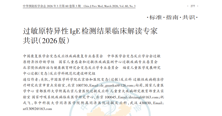近日,由国内多家权威学术组织联合制定的《过敏原特异性IgE检测结果临床解读专家共识(2026版)》(以下简称“共识”)在《中华预防医学杂志》2026年第60卷第3期正式发布。北京京都儿童医院过敏反应科郑成中主任作为撰写专家组成员,参与该共识的制定工作,为过敏性疾病精准诊疗贡献了京都智慧与临床经验。